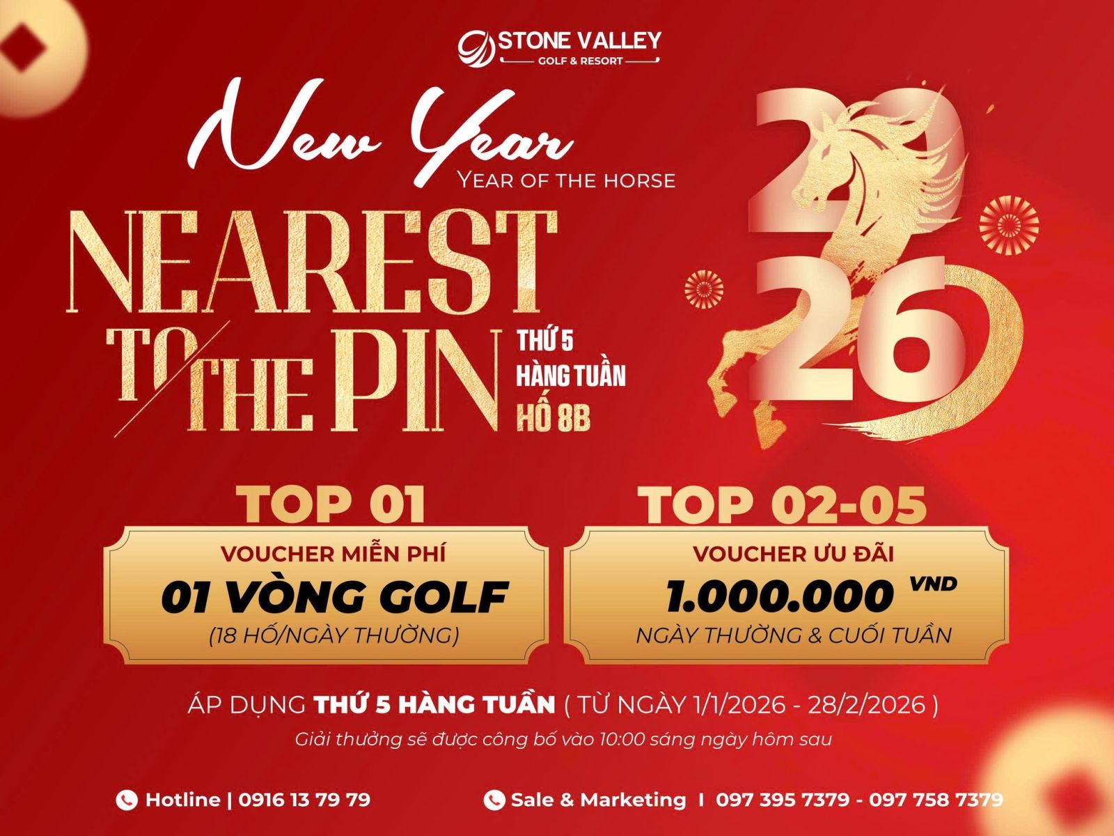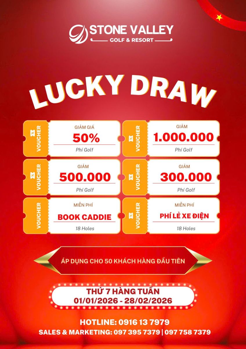 Chương trình “Khai Xuân Trúng Lộc – Nearest To The Pin” được tổ chức định kỳ vào thứ Năm hàng tuần tại hố số 8 – Sân B, áp dụng trong thời gian từ 01/01/2026 đến 28/02/2026. Đây là cơ hội để các golfer vừa trải nghiệm thi đấu hấp dẫn, vừa nhận nhiều phần quà giá trị ngay đầu năm mới.