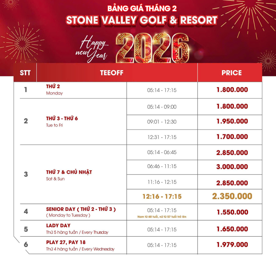 BẢNG GIÁ THÁNG 02/2026 – STONE VALLEY GOLF & RESORT