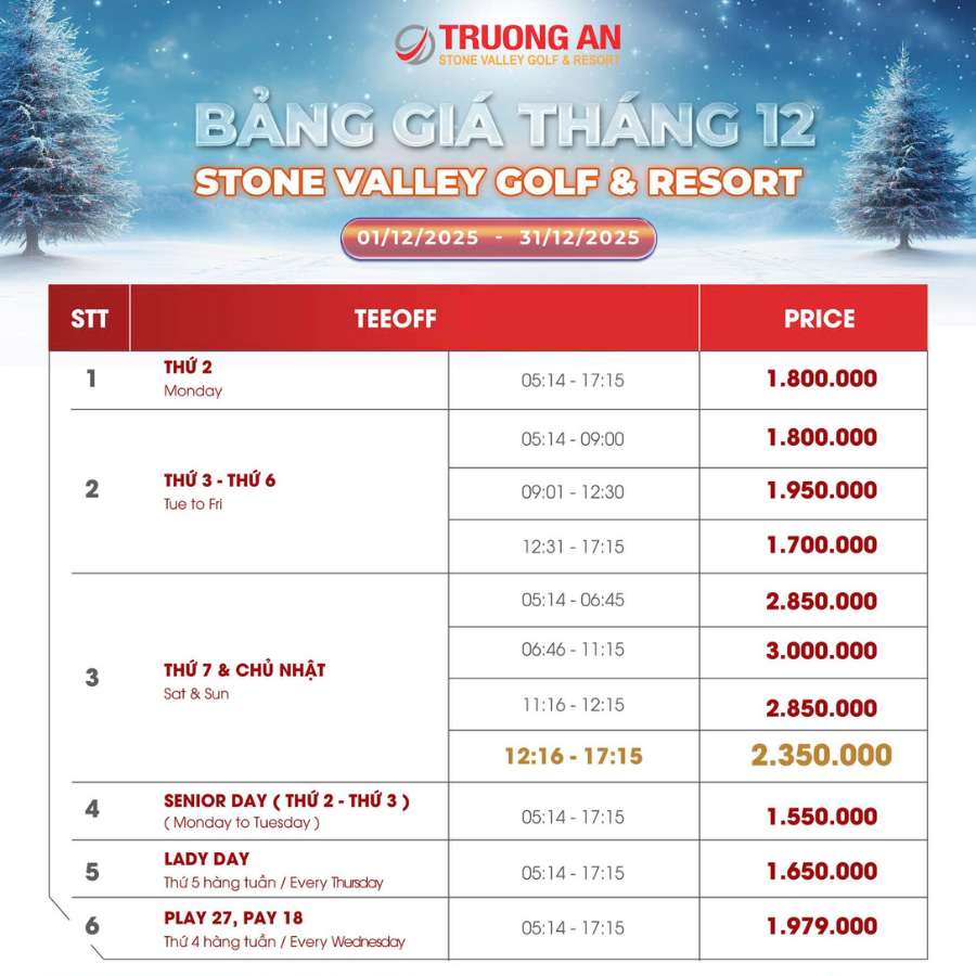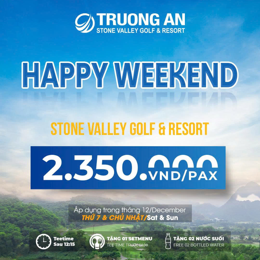 Tận hưởng cuối tuần thư giãn tại Stone Valley với ưu đãi Happy Golf Day. Golfer có thể chọn khung giờ linh hoạt, mức giá hấp dẫn và nhận ngay set menu cùng nước suối khi đặt tee time phù hợp. Một ngày chơi trọn vẹn, nhẹ nhàng và đầy năng lượng đang chờ bạn tại Stone Valley Golf & Resort.